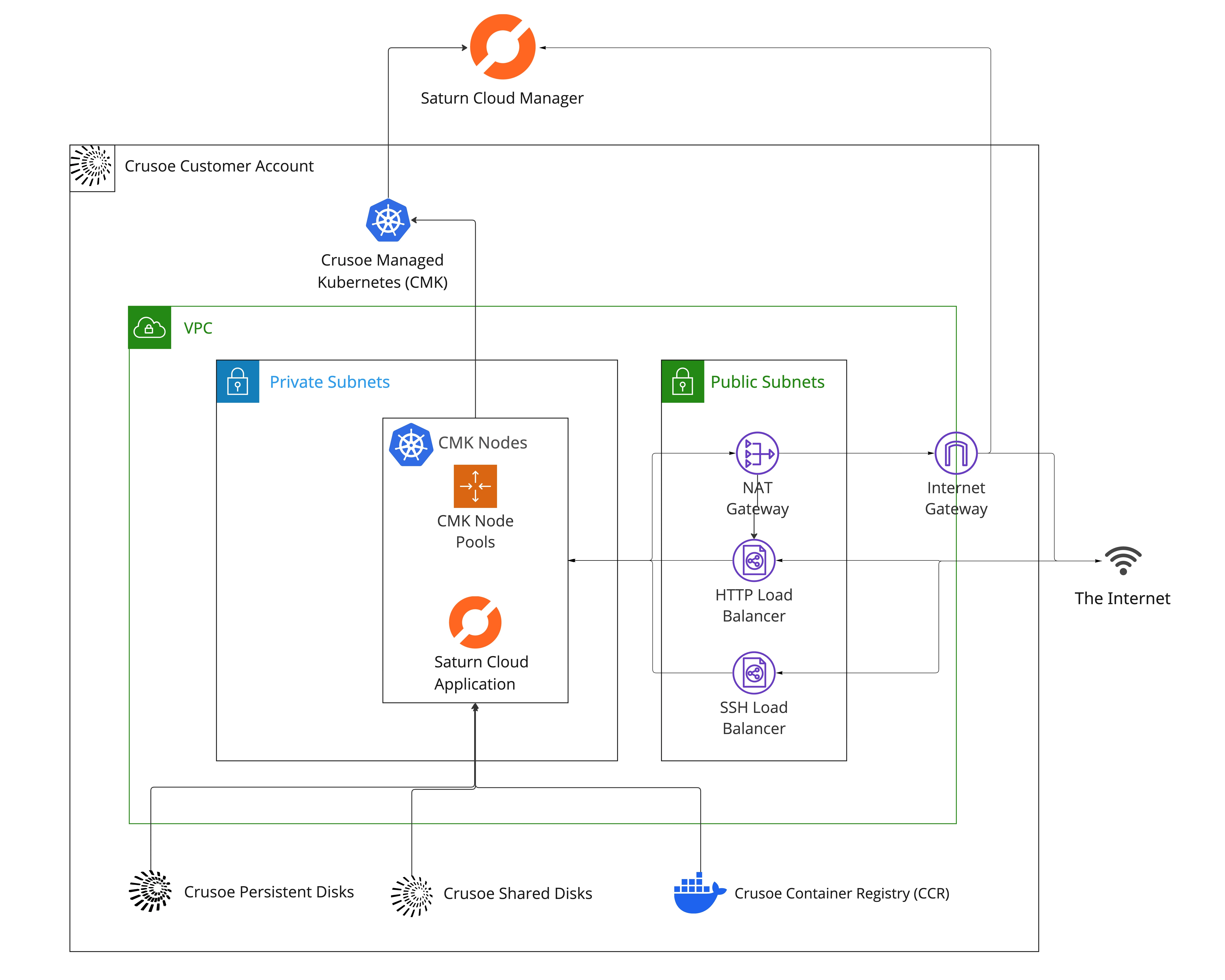 In a typical installation, we provision a Crusoe Managed Kubernetes (CMK) cluster in your Crusoe project, configure CPU and GPU node pools optimized for AI workloads, and integrate with Crusoe storage and networking services. Saturn Cloud is hosted publicly with secure authentication by default, with private networking options available if required.
