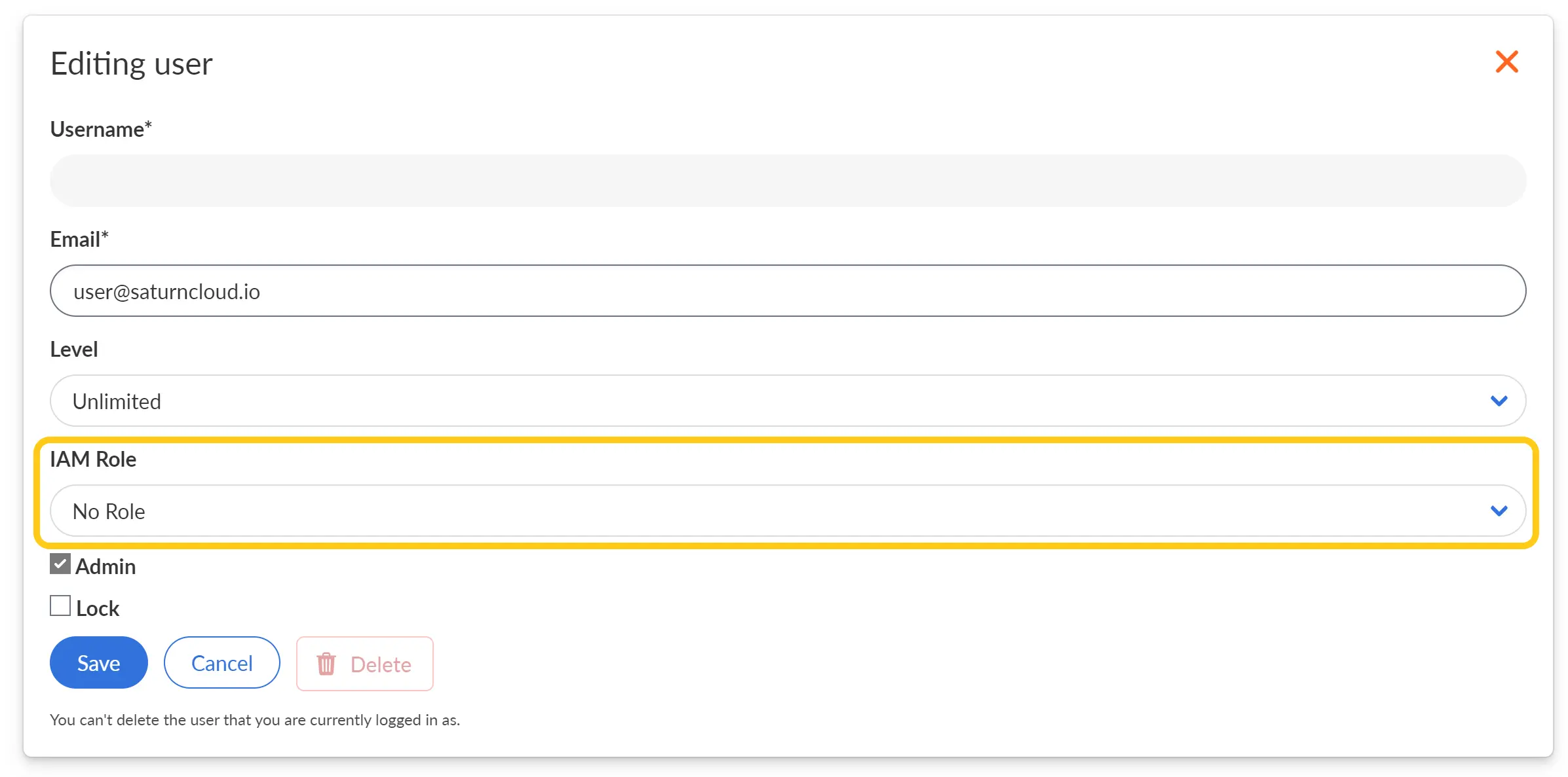 After the role is created, you can attach the role to a particular user or group within Saturn Cloud. Go to the Users & Groups page, click the edit button for the the user or group you want to edit and choose an option for IAM Role.