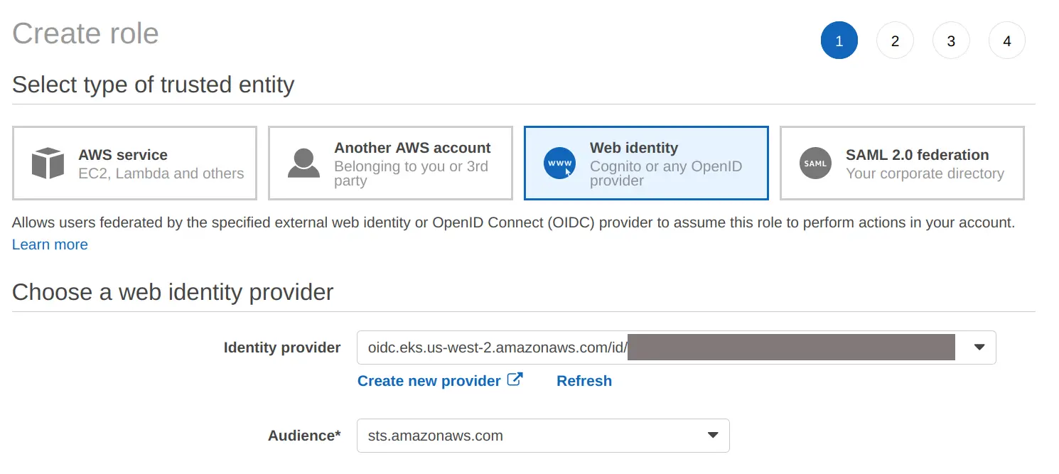 Next, select “Web Identity”, and choose the OIDC provider for your EKS cluster. Choose sts.amazonaws.com as the audience.