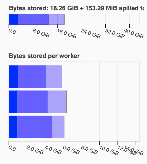 Bytes Stored: The bytes stored part of the dashboard tells us the amount of RAM taken by each worker . In this example below, each line corresponds to a worker. We can see that each worker is taking around 6 GB of ram. The total memory consumed by all workers (in this case 18.26 GB) is displayed at top of the chart.